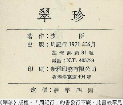 自〈風〉以後,我從未再讀到過波臣的其他作品,直到我買到了這本《翠珍》(香港周記行,1971)。從枕流的序及他自己的後記中得知:波臣出身於山東的貧農家,他只讀過幾年書,做過工人,當過兵,最後以航海作為終生的職業,到過墨西哥灣、澳洲邊的大洋、新加坡,環遊過全世界。《翠珍》集內二三十萬字的作品,就是他一九五一至六一年間在大海上航行時所寫的,每篇都注明寫作日期,遺憾的是沒告訴我們在哪發表。